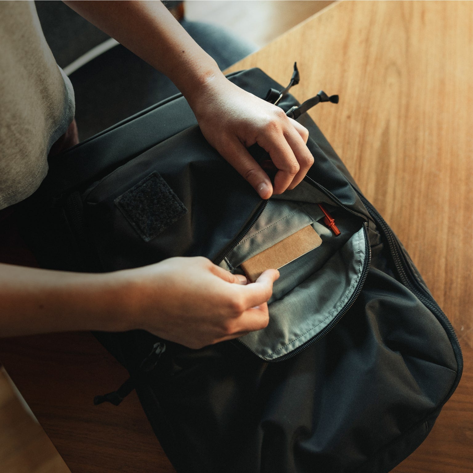 We patterned the front admin pocket with independent volume. It is large enough to fit a CAP1, packable jacket, or notebook – even if the main cavity is stuffed. Our admin pocket also contains 2 drop-in pockets sized for phones or passports, and 1 drop-in slot for a pen or knife. Key leash included.