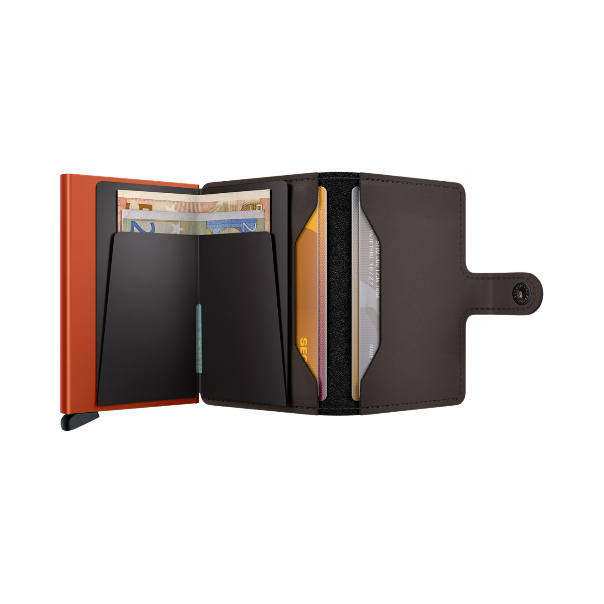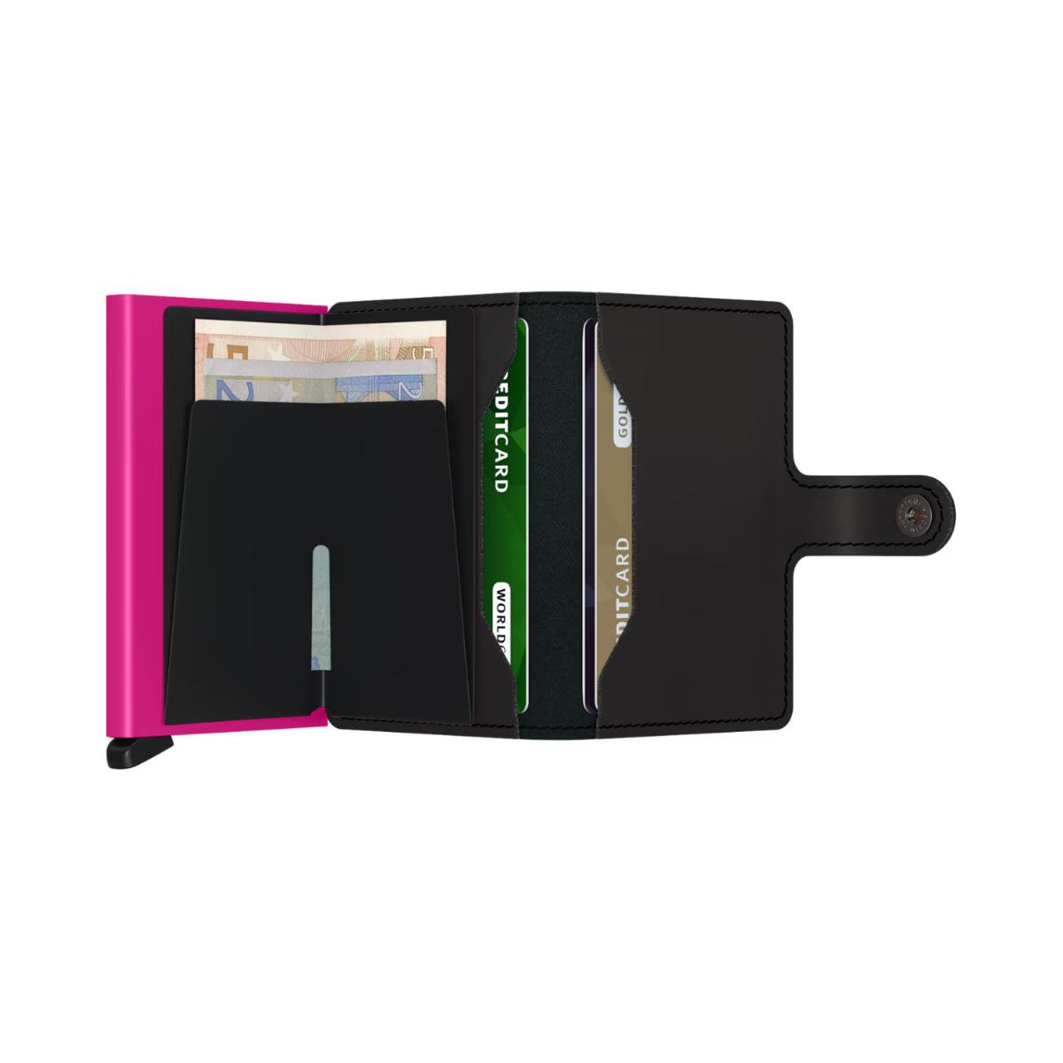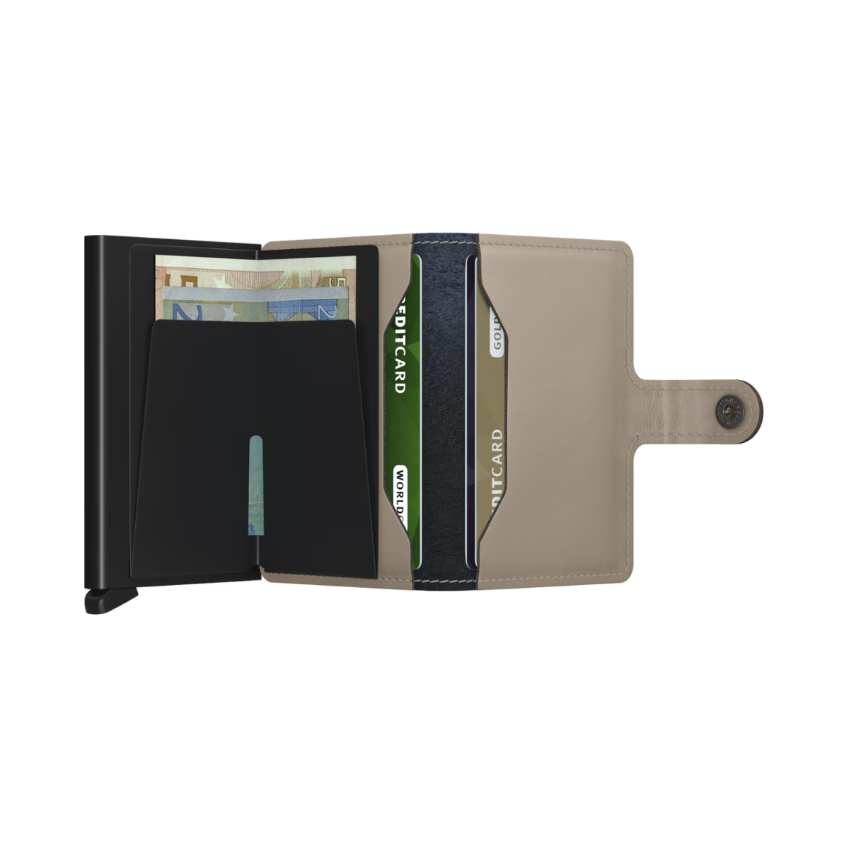 Small in size and surprisingly large in storage capacity, the Miniwallet combines the best of both worlds. The exterior holds banknotes, receipt and cards, while the aluminium Cardprotector allows you to slide out cards with one simple motion and protects them from bending, breaking and unwanted wireless communication.
